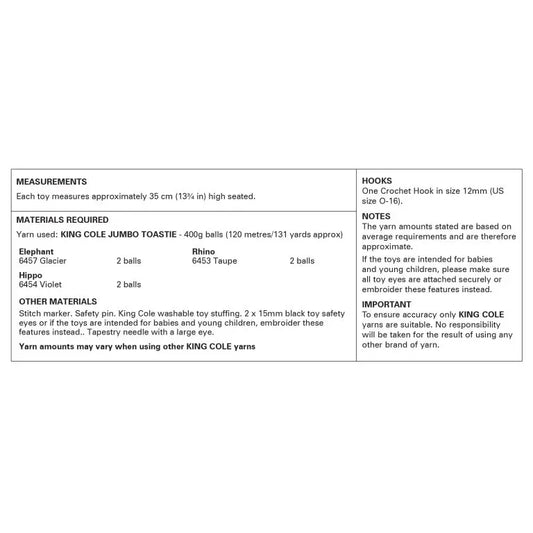 Elephant, Hippo and Rhino Toys crocheted in Jumbo Toastie King Cole Pattern 9217